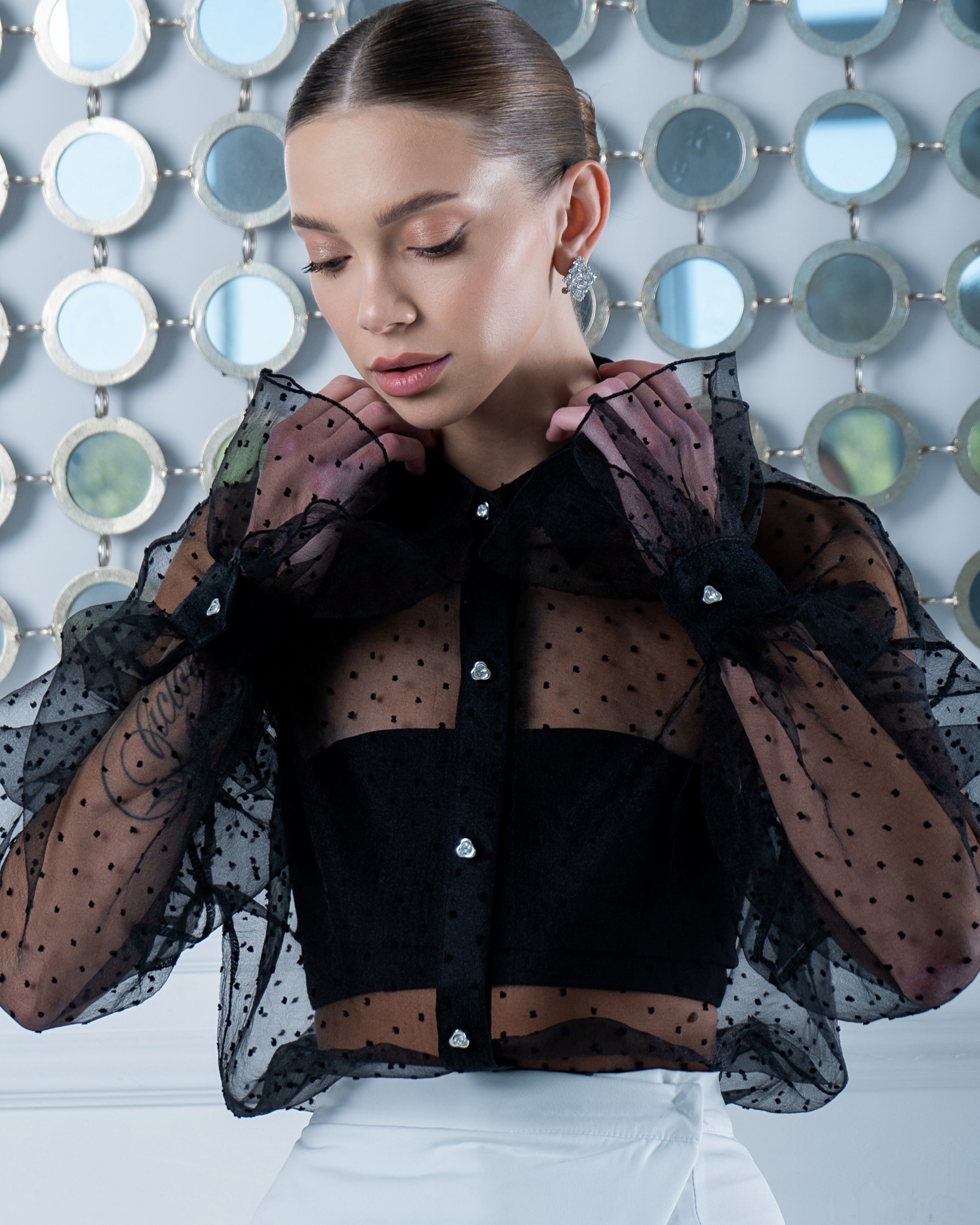 A refined statement shirt crafted from sheer organza, designed to bring elegance and modern femininity to any look. The transparent fabric is delicately textured, creating a light, airy feel while adding visual depth. A classic pointed collar and button-front closure balance the sheerness with tailored structure, while softly voluminous sleeves finished with subtle ruffled cuffs add a romantic touch. The contrast between the sheer organza and the structured detailing creates a sophisticated silhouette, making this shirt perfect for elevated evening styling or polished day-to-night looks.