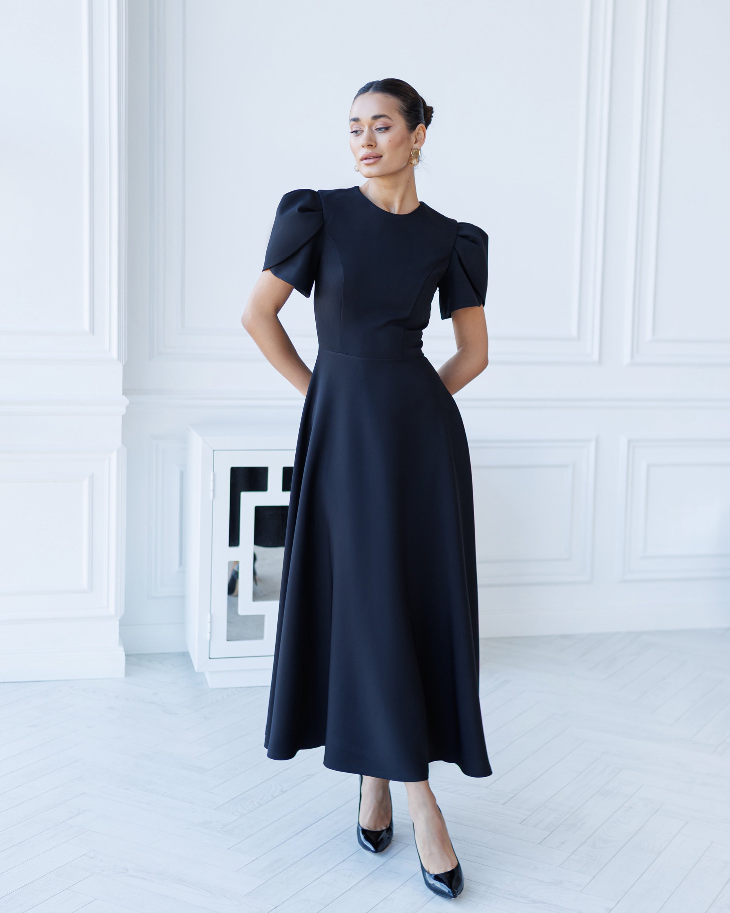 An elegant black midi dress — a classic dress perfect for busy days or an evening out. Designed with structured puff sleeves, a fitted bodice, and a flowing A-line silhouette, it flatters the figure while keeping a timeless, feminine look. Crafted from premium diagonal suit crêpe, it offers smooth structure, comfort, and effortless movement.