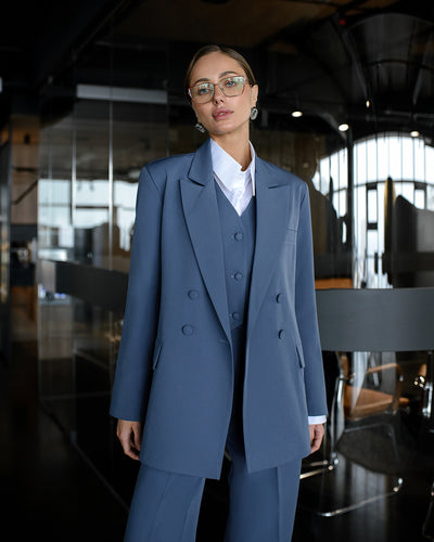 The blazer features structured shoulders and a relaxed silhouette for easy layering. The vest adds a refined edge, while straight-leg trousers elongate the figure for a clean, polished finish. In a muted steel-grey shade, the Mara Suit transitions seamlessly from boardroom to evening, embodying understated luxury.